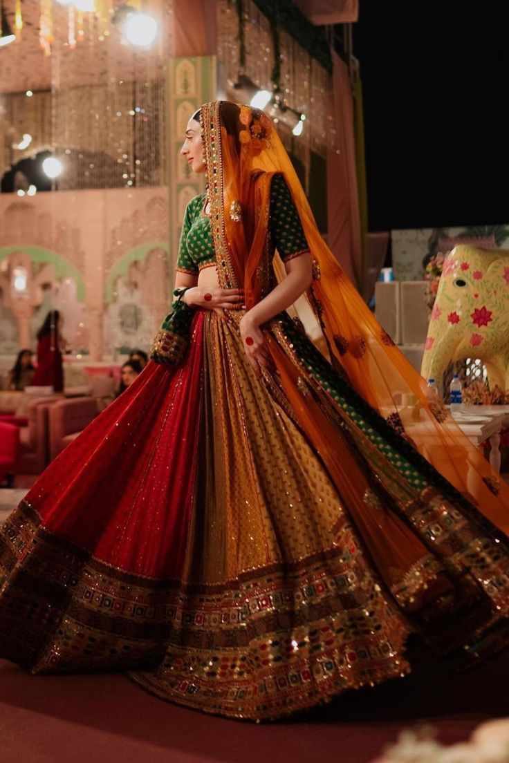 Her bottle-green lehenga shimmered like forest dew; her bangles clinked like poetry in motion. When she smiled faintly, even the mehendi artists paused — as if afraid to disturb that quiet grace.